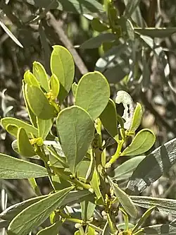 Acacia argyraea is a shrub or tree with smooth grey to brown bark, that typically grows to a height of up to 3 m (9.8 ft) and is covered with silvery, silky hairs. Its branchlets are two- or three-angled, especially near their ends. The phyllodes are narrowly elliptical to elliptical, 40–80 mm (1.6–3.1 in) long, 15–35 mm (0.59–1.38 in) wide and leathery with three to six prominent veins. The flowers are pale yellow, and borne in single spikes in axils 10–25 mm (0.39–0.98 in) long. Flowering occurs in July and August, and the fruit is a flat, linear to lance-shaped pod 60–85 mm (2.4–3.3 in) long, and contains brown, oblong to elliptic seeds 4–6.5 mm (0.16–0.26 in) long.[2][3][4][5][6]