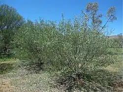 Acacia ayersiana, commonly known as Ayers Rock mulga, broad-leaf mulga, Uluru mulga,[2] or blue mulga,[3] is a species of flowering plant in the family Fabaceae and is endemic to arid areas of inland Australia. It is a rounded or conical shrub with the narrower end towards the base or a singe-stemmed tree, its phyllodes narrowly elliptic to lance-shaped, the flowers yellow and arranged in cylindrical spikes, and papery pods up to 40 mm (1.6 in) long on a short stalk.