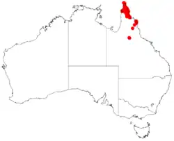This species of wattle is very common on Cape York Peninsula where it grows in deep, sandy soils along creeks and rivers in scrubland communities, often with Melaleuca viridiflora.[2][4]
