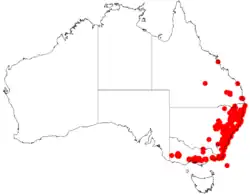 Heath wattle grows on sandy or clay loam in dry sclerophyll forest, woodland or heath in southern and eastern Victoria, New South Wales and Queensland.[2] It is found throughout the Great Dividing Range from around the Grampians in Victoria in the south through New South Wales and up to around Burra Burri in Queensland.[4][5]