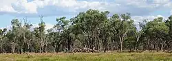 Confined to regions between 550 and 200 mm annual rainfall,[11] A. cambagei is found primarily on flat and gently undulating terrain on heavy and relatively fertile clay and clay-loam soils in the eastern part of it range, and often forms mixed communities with brigalow which favours the same soil types. In drier regions, gidgee is found primarily on red earths and loams in wetter depression and low-relief areas. Gidgee communities are floristically similar to brigalow communities. Eucalyptus cambageana, E. populnea, Corymbia terminalis, Eremophila mitchellii and Geijera parviflora are typical woody species associated with gidgee communities.[12]