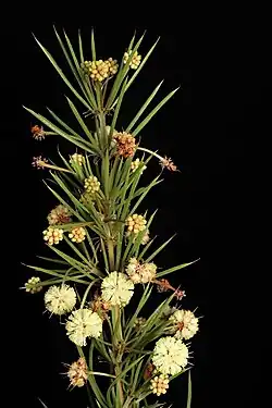 Acacia cedroides is a dense, prickly shrub typically that grows to a height of 0.3 to 1 metre (1 to 3 ft) and has finely ribbed, striated, hairy branchlets. Its phyllodes are arranged in whorls, each phyllode 10–30 mm (0.39–1.18 in) long and 0.8–1.5 mm (0.031–0.059 in) wide, usually glabrous and sharply pointed. The flowers are borne in spherical heads on a peduncle 7–13 mm (0.28–0.51 in) long, each head with 15 to 25 cream-coloured to pale yellow flowers. Flowering occurs from August to November and the pods are more or less terete, thinly crusty to leathery, up to 50 mm (2.0 in) long and 2.5–3.5 mm (0.098–0.138 in) wide, reddish-brown and coarsely striated containing oblong, light greyish-brown seeds 4–5 mm (0.16–0.20 in) long with a conical aril.[2][3][4]
