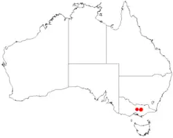 The shrub is endemic to a small area in central Victoria and is only found at a few of sites to the south east of Mansfield around the Howqua River and Mount Timbertop where it can form dense stands. It is often part of dry open Eucalyptus woodland communities.[2]