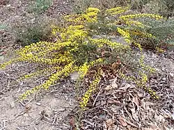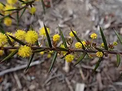 The dense pungent shrub typically grows to a height of 0.2 to 0.4 metres (0.7 to 1.3 ft)[1] and has a prostrate habit. It has terete and densely haired branchlets with semi-persistent triangular stipules that are around 1 mm (0.039 in) in length. Like most species of Acacia it has phyllodes rather than true leaves. The sessile, patent to reflexed, glabrous and evergreen phyllodes are straight to shallowly recurved with a length of 7 to 22 mm (0.28 to 0.87 in) and a diameter of 0.8 to 1.2 mm (0.031 to 0.047 in) and have a brown tip with three nerves per face.[2] It blooms from August to September and produces yellow flowers.[1]