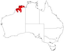 It is native to an area in the West Kimberley region of Western Australia[3] from along the Bonaparte Archipelago and Napier Bay in the west to around the Phillips Range, Kimberley Downs Station and Beverley Springs Station in the east.[4] It is usually found growing in sandy soils over and around sandstone and quartzite.[3]