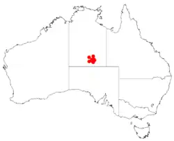 It is endemic to a small area among the plains and hills of the Rodinga Range, Train Hills and Pillar Range on Allambi Station and Todd River Station in the southern part of the Northern Territory to the south of Alice Springs where it is often situated along stony watercourses and in dry rocky gullies at the foot of the ranges and on rocky cliffs composed of sandstone.[4]