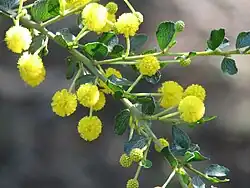 The obconic shrub typically grows to 0.5 to 2 m (1 ft 8 in to 6 ft 7 in) high[2] with slightly hairy branchlets with persistent narrowly triangular thickened stipules that are 0.5 to 1 mm (0.020 to 0.039 in) in length. It has phyllodes that are 6 to 15 mm (0.24 to 0.59 in) long and 4 to 9 mm (0.16 to 0.35 in) wide. They are erect and have an obliquely oval or elliptic shape with two or three raised main nerves.[3] Yellow globular flowerheads appear from August to November in the species' native range.[2] The globular to obloid flowerheads have a diameter of around 5 mm (0.20 in) and contain 45 to 60 flowers. Narrowly oblong seed pods form after flowering with a length of around 3 cm (1.2 in) and a width of 4 to 7 mm (0.16 to 0.28 in). The ovate shaped brown seeds within have a length of around 3 mm (0.12 in) and are arranged longitudinally.[3]