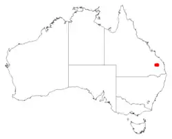 It is confined to a small area of South East Queensland in the Bunrett pastoral district. The population is around 45 km (28 mi) south west of Gayndah and a similar distance south east from Mundubbera. The population has a range of around 10 km (6.2 mi) and is composed of around 5,000 plants.[1] It is situated within an area of 4 to 5 ha (9.9 to 12.4 acres) and is found on an among granite outcrop at an altitude of 460 to 550 mm (18 to 22 in).[2]