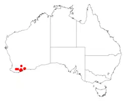 It is endemic to an area in the Goldfields-Esperance, Wheatbelt and Great Southern regions of Western Australia found on undulating plains and clay pans growing in gravelly clay-loam-sand soils.[1] It has a scattered distribution between Broomehill in the west, Albany in the south and Ravensthorpe in the east. It is most often a part of woodlands usually mallee and Acacia shrubland communities.[2]