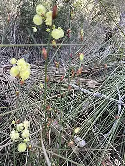 The rush-like shrub typically grows to a height of 0.3 to 0.75 metres (1 to 2 ft) and produces yellow flowers from May to September.[1]