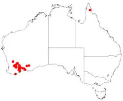 It is native to an area in the Wheatbelt and Goldfields-Esperance regions of Western Australia where it is commonly situated on undulating plains growing sandy or clay-loam soils.[2] It has a scattered distribution from around Cadoux in the north west down to around Dunn Swamp about 100 km (62 mi) north of Raventhorpe in the south east.[3]