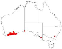 It is native to an area along the south coast in the Goldfields-Esperance and Great Southern regions of Western Australia from around the Stirling Ranges in the north to Albany in the west to around Israelite Bay in the east where it is found on plains, flats and sand dunes growing in gravelly sandy lateritic or quartzitic soils[2] usually as a part of heath, mallee or open Eucalyptus woodland communities.[3]
