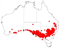 Hakea wattle is widespread and common in open scrub, Eucalyptus woodland or mallee in western New South Wales,[3] north-western Victoria,[6] southern coastal areas of South Australia including the Nullarbor region,[4] and the Coolgardie, Hampton, Mallee and Nullarbor bioregions of southern Western Australia.[10]