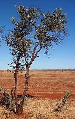 Kanji bush is a gnarled tree or shrub with a single trunk,[2] corky bark, spiny foliage and stems. It grows to a height of between 2 and 5 m (6 ft 7 in and 16 ft 5 in) but can reach as high as 8 m (26 ft).[1] It has thick, rough, corky, dark grey to black coloured bark on the main trunk that is often scarred by fire.[2] Like most Acacia species, it has phyllodes rather than true leaves. These are a blue-grey colour, with a curved midrib and a short spine at the tip. There is also a pair of curved spines at the base of each leaf. The leathery phyllodes have an asymmetrically ovate to elliptic shape. They are 1.5 to 7 cm (0.59 to 2.76 in) in length and 6 to 45 mm (0.24 to 1.77 in) wide and the apex terminates in a needle-sharp tip.[2] Unusually for Acacia species, the flowers are not pure yellow, but rather yellow with a reddish purple centre. The flowers occur between May and October.[1] are held in spherical clusters about 5 mm (0.20 in) in diameter. The pods are flat and curved, up to 10 cm (3.9 in) long and 1 cm (0.39 in) wide. They can be strongly curved to coiled and are raised high over the seeds and slightly constricted between. The pods have a pale maroon colour when young but deepen to a mid-brown or pinkish-purplish brown as they age. The dull dark brown seeds within are arranged longitudinally oblique within the pod. Each seed has a length of 4 to 6 m (13 to 20 ft) and has an obloid to globose shape.[2]