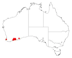 It is native to an area along the coast in the South West and Goldfields-Esperance regions of Western Australia where it grows in gravelly lateritic clay-loam and sandy soils.[2] The bulk of the population is found on the south coast between Mid Mount Barren near Ravensthorpe in the west and Young River in the east[1] with an isolated population found on the west coast around Busselton.[2]