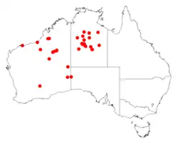 It has a scattered distribution in the Kimberley, Pilbara and Goldfields-Esperance regions of Western Australia where it is found on plains and sand dunes growing in red sandy soils[1] and in sandstone gullies. It is also found in the Northern Territory in the Tanami Desert where it is situated on the slopes and crests of sand dunes.[2]
