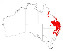 It is native to an area in southern Queensland around Port Clinton in the north extending into New South Wales to around Glenbrook and extending to about 500 km (310 mi) inland.[2] It is usually a part of dry sclerophyll forest and woodland communities growing well in sandy soils. In New South Wales it is extends north from around Glenbrook and as far west as Gilgandra.[1]