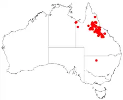 It is endemic to western parts of the Kennedy and Cook Districts of Queensland usually along the lower slopes of the Great Dividing Range where it is usually situated on ridges, slopes or hill tops growing in gravelly red soils or shallow sandy soils over sandstone or granite bedrocks as a part of Eucalyptus forest or woodland communities or in scrubland along with other species of Acacia and species of Triodia.[1]