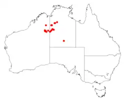 It is native to an area in the Northern Territory and the Kimberley and Goldfields-Esperance regions of Western Australia and is commonly situated along the margins of lakes that are periodically flooded growing in sandy or loamy soils.[2] The range of the plant extends from around Gregory Salt Lake in the west through to around Nongra Lake in the Tanami Desert in the east where it is usually a part of low open forest or woodland or open scrubland communities.[1]