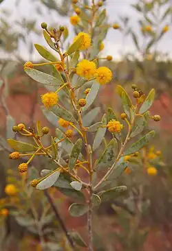The V-shaped or rounded[1] glabrous and resinous[5] shrub typically grows to a height of 1.0 to 4.0 metres (3.3 to 13.1 ft) with the stem dividing at ground level into many spreading-erect generally straight main stems forming a sparse to mid-density the crown. The bark is rough and dark grey at base of older stems otherwise smooth and light grey.[1] The branchlets are tuberculate.[5] It has stiff straight dull grey-green phyllodes that are 3 to 4.5 centimetres (1.2 to 1.8 in) in length and 5 to 10 millimetres (0.197 to 0.394 in) wide.[7] The phyllodes have an obovate to oblanceolate or narrowly oblong-elliptic shape with two or three prominent longitudinal nerves.[1] It produces yellow flowers from May to September.[7] The simple flower-spike has one to three globular shaped golden flower-heads per axil.[1] Each flower-head has a diameter of 5 to 8 mm (0.197 to 0.315 in) contains 30 to 40 individual flowers.[5] The flowers have a distinctive honey-like odour.[3][2] After flowering brown and narrowly oblong seed pods form that are up to a length of 9 cm (3.5 in) and a width of 1.5 cm (0.59 in) and contain dark brown ovoid shaped hard seeds that are about 4 mm (0.157 in) in length and 2.5 mm (0.098 in) wide.[2]