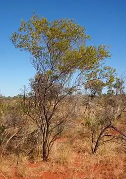 It is native to southern and central parts of the Northern Territory,[6] the north western corner of South Australia,[2] central Queensland[1] and the Kimberley, Pilbara and Goldfields regions of Western Australia where it is found on dunes and sand plains growing in shallow stony or red sandy soils often around laterite.[7] It is usually found as part of open Eucalypt woodland or spinifex communities.[3]
