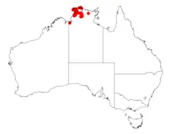 It is found in north western parts of the Northern Territory including on Melville Island to the north and down to around Katherine in the south where it is found growing in gravelly lateritic soils with a scattered distribution amongst open woodland and forest communities.[1]