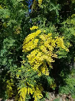 Arranged in racemes, the globular yellow flowers appear from late winter to spring (August to October),[2] peaking in September. Each flower head contains 12 to 20 flowers. Flowering is followed by the development of 3–7 cm long seed pods, which ripen over October to December.[3]