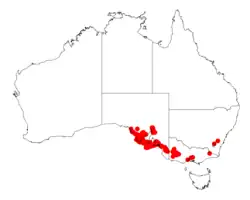 It is endemic to a large area extending from the Eyre Peninsula in South Australia in the west thorough to Bordertown and to the Grampians in the Victoria in the east. It is found in rocky coastal areas in sandy to loamy soils often as a part of open scrub or woodland communities.[1]
