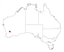 It is native to a small area in the Wheatbelt region of Western Australia.[2] The range of the plant is confined to an area of less than 10 km2 (3.9 sq mi) in the Shire of Mukinbudin about 18 km (11 mi) south west of the town of Mukinbudin,[1] between the town and Bencubbin[3] where the population is severely fragmented and with and a continuing decline in the number of mature individual. It grows in gravelly sandy that overlies laterite as a part of shrubland communities dominated by Acacia neurophylla, Acacia merrickiae, Allocasuarina corniculata Allocasuarina campestris and with hummock grassland species. The species is represented by two main populations or seven subpopulations with a total of 484 separate plants.[1]