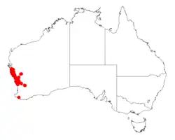 It is native to an area in the Mid West and Wheatbelt regions of Western Australia where it grows in gravelly sandy soils.[1] It is found from the Cooloomia Nature Reserve in the north down to around Moora in the south and is often situated on road-verges.[2]