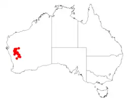 It is native to an area in the Mid West and Wheatbelt regions of Western Australia where it is often situated on hills and amonggranite outcrops growing in shallow sand or clay-sand soils.[1] The range of the shrub extends from the Weiragoo Range located about 180 km (110 mi) to the west of Meekatharra in the north west down to around Paynes Find in the south where it is usually a part of open scrub land communities.[2]
