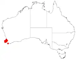 It is native to a small area in the South West region of Western Australia where it is commonly situated on sandplains or in swampy areas growing in clay or sandy soils, sometimes over laterite.[1] the range of the shrub extends from around Yarloop in the north down to around Collie and the Whicher Range in the south where it found growing in open heathland surrounding swamps in open jarrah forest communities.[2]