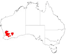 It is native to an area in the Wheatbelt and Goldfields-Esperance regions of Western Australia where it is commonly situated on flats growing in loamy or sandy-clay soils.[1] The distribution of the shrub extends from Wyalkathem in the north down to around Corrigin and Beverly in the south to around Queen Victoria Rock in the east[2] usually as a part of open Eucalyptus woodland or mallee woodland communities or shrublands of Melaleuca uncinata and species of Casuarina.[2]