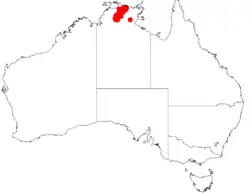 The species has a limited range within western Arnhem Land and within the boundaries of Kakadu and Katherine Gorge National Parks between Gunbalanya and Edith Falls in the Northern Territory where it is found on escarpments and along creek lines growing in clay or sandy soils as a part of woodland or scrubland communities composed of species of Eucalyptus, Melaleuca and Triodia.[1]