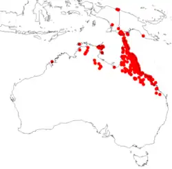 In the Territory, it is found in the bioregions Arnhem Coast, Cape York Peninsula, Einasleigh Uplands, Gulf Fall and Uplands, Gulf Plains, Northern Kimberley, Pine Creek, Tiwi Cobourg, and Wet Tropics.