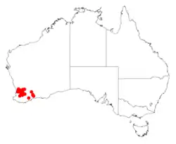 It is native to an area in the Wheatbelt regions of Western Australia where it is commonly situated on ridge, hills and undulating plains growing in sandy or clay-loam soils often over or around granite or laterite.[1] The range of the plant extends from around Toodyay in the west to around Cunderdin in the east and as far south as the Dryandra Woodland with disjunct populations found near Lake King as a part of jarrah or wandoo or mallee woodland or scrubland communities.[2]