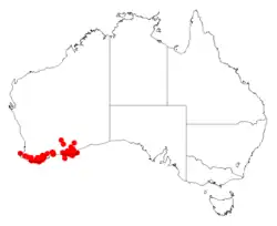 It is native to an area along the south coast in the South West, Great Southern and Goldfields-Esperance regions of Western Australia where it is commonly situated among granite outcrops and on hills and rises growing in gravelly clay or sand or sandy soils with laterite or quartzite or granite.[1] The range of the plant extends from around Busselton in the west then scattered along the south coast with the bulk of the population found between Mount Frankland out to Cape Arid National Park in the east.[2]