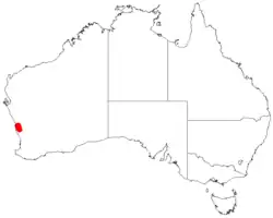 It is native to an area in the Wheatbelt and Mid West regions of Western Australia.[1] The range of the species extends from around Eneabba in the north and down to around Badgingarra in the south where it is found growing in sandy or loamy soils usually over laterite and commonly situated on hills or slopes as a part of open heath or mallee woodland communities. It is found to be associated with Eucalyptus suberea, Allocasuarina campestris, Calothamnus quadrifidus, Eucalyptus gittinsii, Eucalyptus eudesmioides, Eucalyptus accedens and Grevillea amplexans.[3]