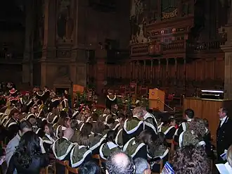 As with the other Ancient Universities of Scotland, undergraduates at the University of Edinburgh are entitled to wear an undergraduate gown, made of scarlet Russell cord and cut in the London undergraduate shape.[2] In recent times the undergraduate gown has been worn most commonly by members of the Edinburgh University Singers, the top table of The Diagnostic Society of Edinburgh and by students taking part in the traditional festivities surrounding the installation of the Rector.