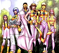 ![]() The New Mutants from New X-Men: Academy X #2 by Randy Green. From left to right: Danielle Moonstar, Surge, Prodigy, Wind Dancer, Elixir, Wallflower. | |