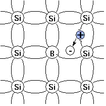 When substituting for a silicon atom in the crystal lattice, the three valence electrons of boron form covalent bonds with three of the Si neighbours but the bond with the fourth remains unsatisfied. The initially electro-neutral acceptor becomes negatively charged (ionised). The unsatisfied bond attracts electrons from the neighbouring bonds. At room temperature, an electron from a neighbouring bond can jump to repair the unsatisfied bond thus leaving an electron hole, which is a place where an electron is deficient. The hole, being positively charged, attracts another electron from a neighbouring bond to repair this unsatisfied bond. This chain-like process results in the hole moving around the crystal as a charge carrier. This process can sustain in an electric current useful in electronic circuits.