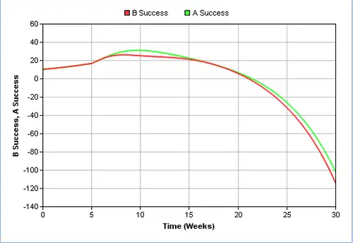 Both parties show a similar trend in direction and rate of change of success, with one trailing behind the other one due to system delays. Even though the pattern shows stable periods, the overall trend follows a downward direction.[2] The above simulation can be run from InsightMaker.[5]