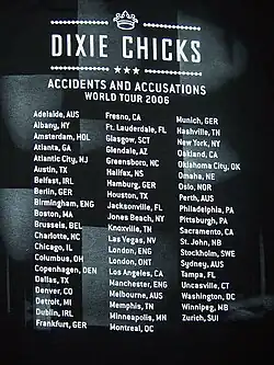 - ^ a b Waddell, Ray (May 18, 2006). "Dixie Chicks Set 'Accidents & Accusations' Tour". Billboard. Archived from the original on May 25, 2006. Retrieved November 18, 2013.