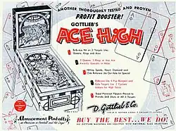 Ace High is a woodrail pinball machine released by Gottlieb in 1957. It features a card gambling theme.[1] It should not be confused with Aces High by Bally.[2]