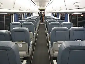 The First Class car has 44 seats, being three seats across (one on one side, two on the other side), four seat tables and assigned seating. There are 260 Business Class seats on each set; these cars have four seats across (two on each side) and four-seat tables.[44] Baggage may be stowed in overhead compartments or underneath seats. Trains are wheelchair-accessible. Each car has or two toilets, with one being ADA compliant. Automatic sliding doors between cars reduce noise.