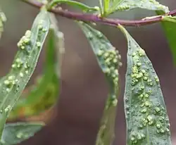 Aceria baccharices, also known as the mulefat leaf-blister mite and formerly known as Eriophyes baccharices, is a species of arachnid native to North America that induces galls on two California willows, Baccharis salicifolia and Baccharis glutinosa.[1][2] This mite was first described to science by Hartford H. Keifer in 1945.[3] According to Keifer, "the typical host is the long-leaf type Baccharis which is common to dry washes in northern California. The other host is similar but confined to the south."[3] These galls, which look like warty protrusions from the surface of the leaf, are nurseries for the next generation of mites.[2] The adults eventually leave the leaf via anterior exit holes that may be visible.[2]