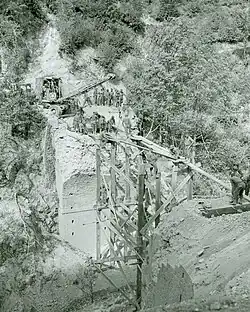 During World War II, the Anglo-American air forces bombed Acerno, the first time in September, 1943, destroying part of the bishop's palace, the church of S. Maria degli Angeli as well as numerous blocks.[4] On 16 September 1943 five German soldiers invaded the garden of Canon Carmine Sansone, and while they were busy gathering the fruit from the trees, were killed with precision fire from a rifle by the priest.[4] The Germans then shelled the house of the canon, the priest escaped but his niece died in the event.[4]