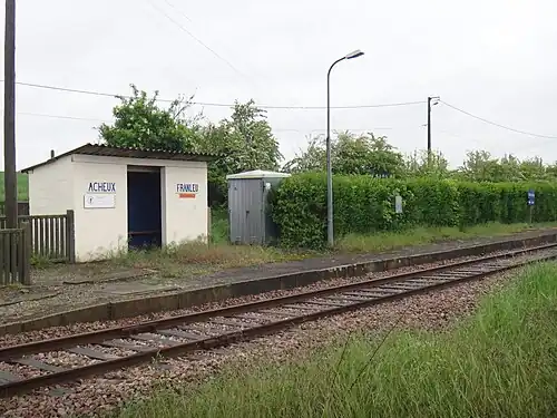 Acheux—Franleu station (French: Gare d'Archeux—Franleu) is a former railway station in Chépy and near Acheux-en-Vimeu and Franleu, Hauts-de-France, France. The station opened in 1873 and is located on the Abbeville-Eu railway. The station was served by TER (local) services between Abbeville and Le Tréport operated by SNCF. Train services were discontinued in 2018.[1]