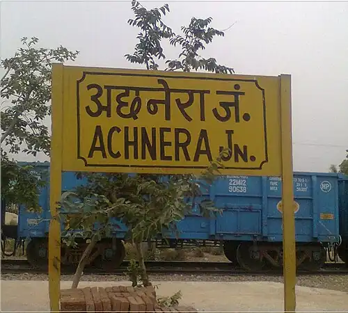 Achhnera Junction railway station (station code AH) is a railway station located in Agra district in the Indian state of Uttar Pradesh.[1][2][3] It has an average elevation of 167 metres (547 feet). It is reachable through Agra Jaipur Highway. The city is connected by rail to Agra, Jaipur, Kanpur and Mathura.[4]