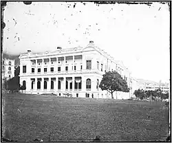 Work on the huge Saigon Governor's Palace began in earnest when Hermitte brought in skilled workmen from Canton and Hong Kong. The site of the Palais du Gouverneur turned out to be waterlogged and the foundations required constant repair to counteract subsidence throughout the building's life.[12] Most of the materials were imported from France, adding to the cost.[13] Completion of construction was celebrated informally on 25 September 1869 with a banquet and a ball for everyone involved in the project.[12] The final, formal opening of the palace took place in 1873 under Governor Marie Jules Dupré.[13] Dupré moved into the building that year, and the decorations were completed in 1875. The total cost was 12 million francs, over a quarter of the budget for public works in Cochinchina.[14]